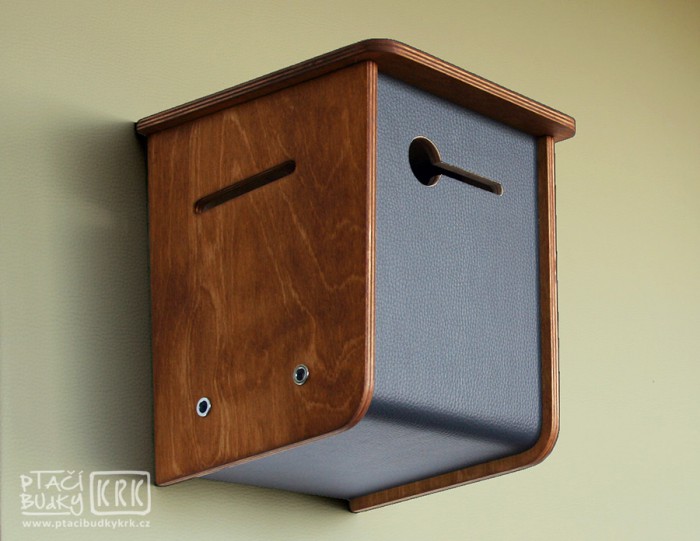 Ptačí budka v koženkovém provedení se stříškou. Vhodná pro Strakapouda velkého (Dendrocopos major), Lejseka černohlavého (Ficedula hypoleuca), větší druhy sýkorek a další.