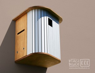 Ptačí budka v kombinaci plastových lamel a překližky pro větší letce jako je Špaček obecný (Sturnus vulgaris), Strakapoud velký (Dendrocopos major) a pod.