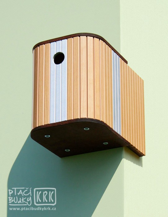 Originální rohová ptačí budka. Jako dělaná pro Sýkoru koňadru (Parus major), Lejseka černohlavého (Ficedula hypoleuca), Rehka zahradního (Phoenicurus phoenicurus) a další.